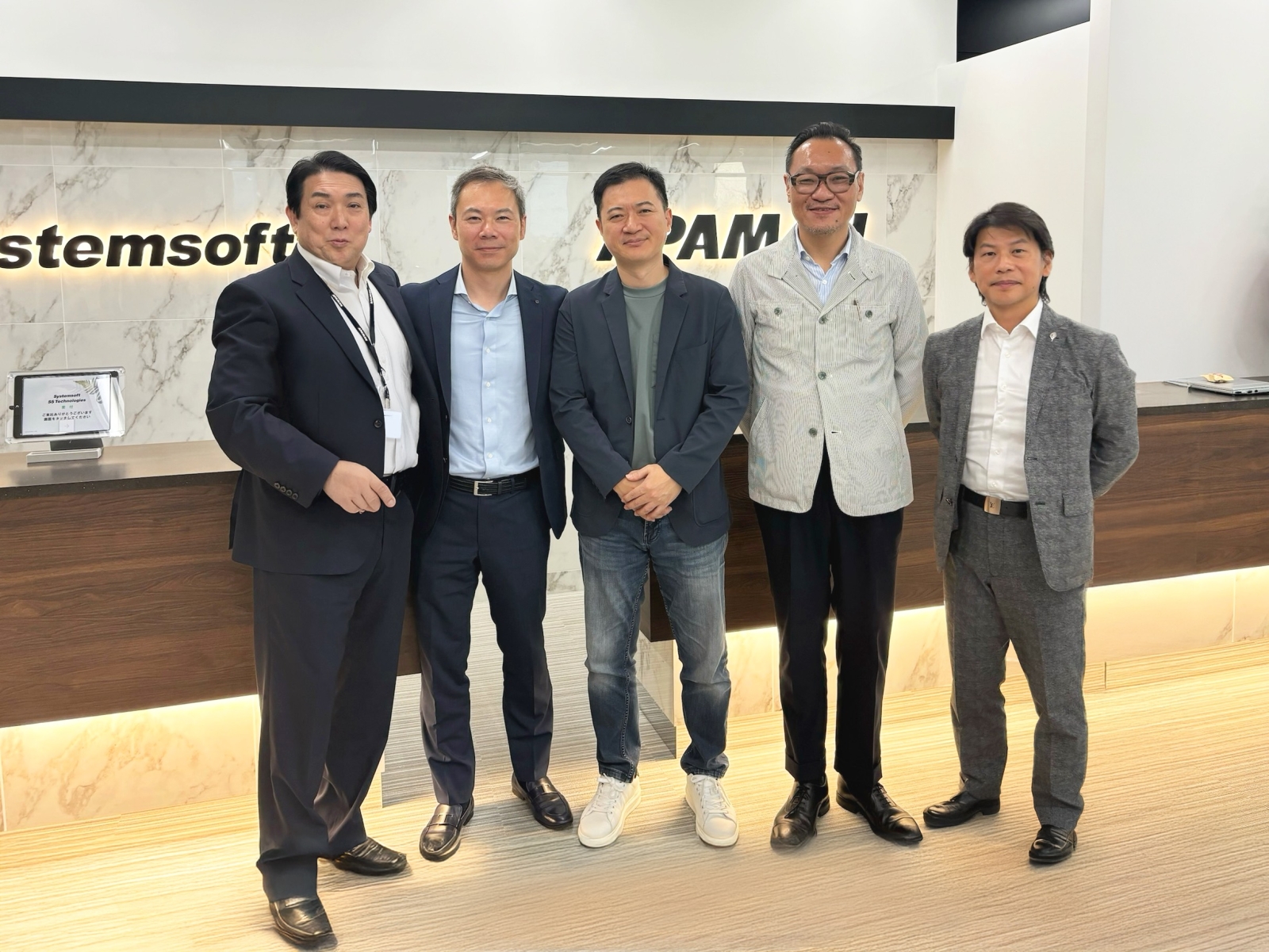 由左至右為 APAMAN CEO 大村浩次(Koji Omura)、NETTOWER CEO 江野俊銘(Kohno Shummei)、KDAN 創辦人兼董事長 蘇柏州、KDAN 日本子公司負責人 黃一桂 及 KDAN 財務長 林建佑